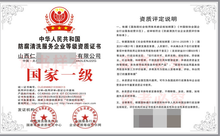 防腐清洗服务企业等级资质可分为,主管部门申报和第三方申报: 主管部门申报诚信企业家荣誉证的流程比较繁琐,申报周期比较长,需要的资料比较繁多,拿证时间长。 要先审核是不是主管部门授权的证书办理点,第三方办理吗,受理的快,流程简单、申报周期也比较多短,一般15个工作日就可以拿证,企业只需要提供需要要的资料即可。 湖南环宇清洁家政产业基地考评中心是中清协、中清委、中国产品质量认证监督管理中心、中国企业信用评估中心、安监局、认监委、人社厅、住建部、全国总工会职业教育培训中心等机构授权的培训基地和考评中心。湖南环宇清洁家政产业基地考评中心 除此之外还可以办理其它清洁企业资质。