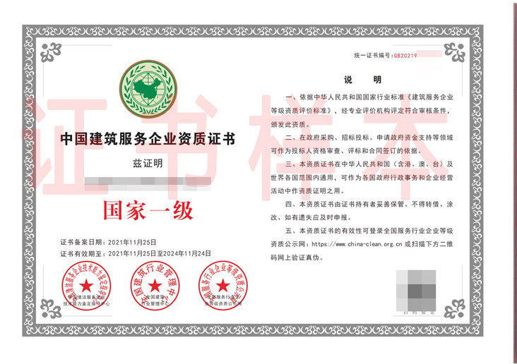 清洗保洁服务企业国家等级资质认证
