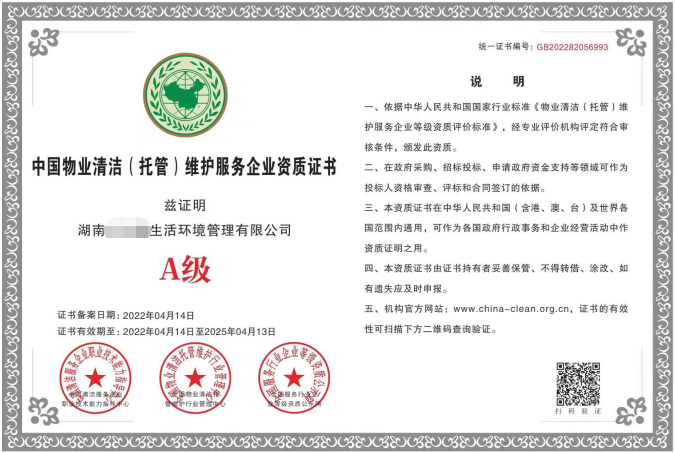 清洗保洁服务企业国家等级资质认证