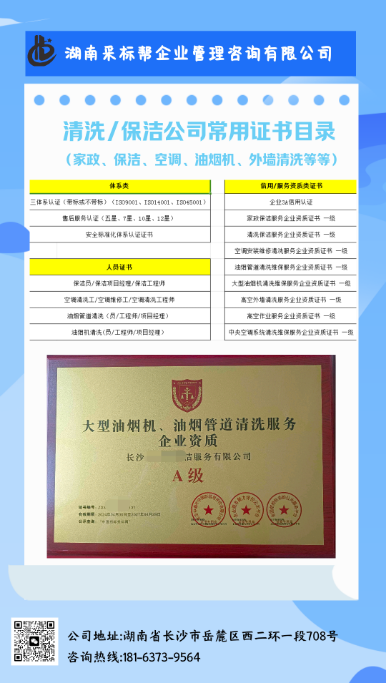 1、湖南采标帮企业管理咨询有限公司主营:清洁、家政行业代办资质、代做标书、企业培训、保险代理、企业审计报告。 ①.【个人/企业资质代办、代做标书、企业培训】 请联系TEL:18163739564付老师/(微信同号) ②.【雇主责任险投保咨询】 请联系 TEL:19173194637王老师/(微信同号) 2、湖南环宇家政产业管理有限公司主营:家庭服务、生活清洗、清洁服务、环境卫生管理、物业管理、工程开 荒、物业清洁、维护建筑物外墙清洗、防虫灭鼠服务、白蚁防治服务、烟囱清洗服务等。请联系TEL:13981155222杨先生/(微信同号)