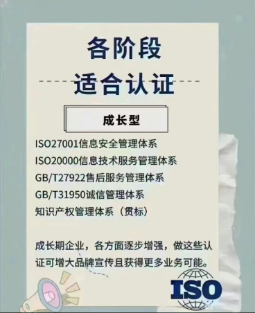 2.进阶型:ISO27001信息安全管理体系SO20000信息技术服务管理体系;GB/T27922售后服务管理体系;GB/T31950诚信管理体系,等等;