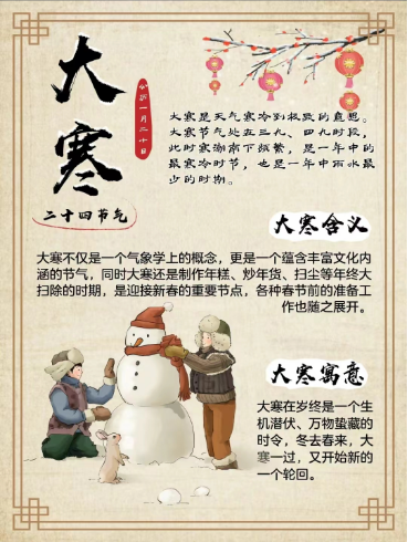 大寒是冬季六节气之一,此时天气寒冷已极,故名大寒。大寒的养生,要着眼于“藏”。意思是说,人们在此期间要控制自己的精神活动,保持精神安静,把神藏于内不要暴露于外。这样才有利于安度冬季。