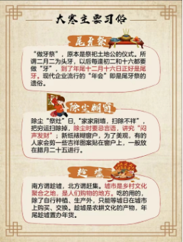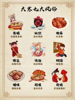 按我国的风俗,特别是在农村,每到大寒节,人们便开始忙着除旧布新,腌制年肴,准备年货。在大寒至立春这段时间,有很多重要的民俗和节庆。如尾牙祭、祭灶和除夕等,有时甚至连我国最大的节庆春节也处于这一节气中。大寒节气中充满了喜悦与欢乐的气氛,是一个欢快轻松的节气。