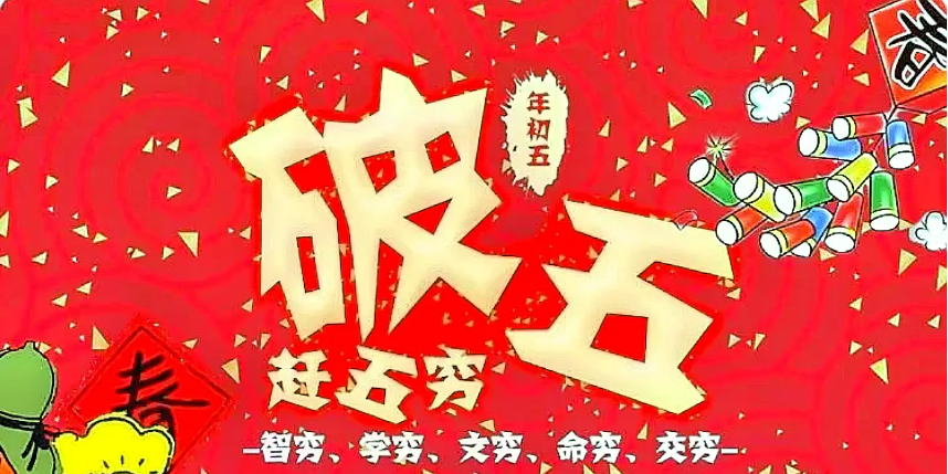 "五穷"也叫"五鬼"。分别指"智穷、学穷、文穷、命穷、交穷"等五种穷鬼。老话说,"赶五穷","填穷坑",就要用爆竹扫帚,不能客气。所以这天除了放鞭炮迎财神,也还有赶五穷的意思。正月初五这天,还有个习俗就是要扫地,从每个房间里把垃圾扫出门外,不仅破了正月初几不能扫地的风俗,还寓意着送走旧日贫穷困苦,干干净净的迎接财神的到来。