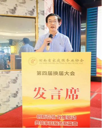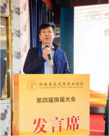 最后,潘繁荣处长发表了重要讲话,他首先对过去第三届协会班子工作情况做了表扬和肯定,对黄跃佳当选会长以及协会新一届班子成员表示祝贺。在讲话中他说:“回顾家政服务业的发展历程,家政服务行业已经由速度发展阶段向高质量发展阶段转变”。截止2023年,全省家政服务企业已经接近5000余家,从事家庭服务行业人员突破60多万人,解决了省内大几十万人的就业问题,为全省近400万户家庭提供了各种需求和服务,为此家政服务行业已成为广大人民群众和家庭不可或缺的民生事业。同时家政服务行业也是朝阳产业大有可为,湖南省委省政府有支持措施。先后出台了《十四五规划》《湖南省家政服务劳务对接行动方案》等政策文件和专项资金支持行业发展,家政服务工作更是省商务厅“五个重大”“八大行动”的重要内容之一;加之二胎三胎政策、老龄化的大背景,都决定了家政行业的前景是优质股、潜力股,会一路飘红。