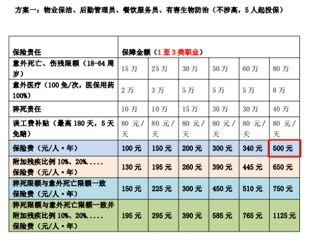 2、最高保障80万+8万:保费500元/人/年。十级伤残比率为1%。