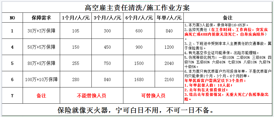 本方案可以承保月单、半年单和年单,3人起保,最高可承保100万保障,出单快,也是目前市场上唯一一款不需要高做作业证出险亦能理赔的方案。联系人:王老师/19173194637(微信同号)
