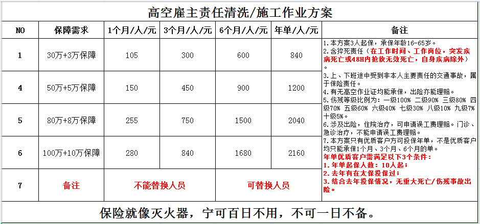 100万+10万保障,保费280元/月/人、2160元/年/人(有无高空作业证均能承保及出险享受理赔)。