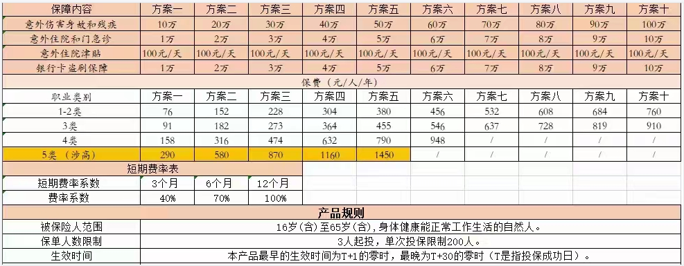 50万+5万保障,保费180元/年/人 80万+6万保障,保费270元/年/人。