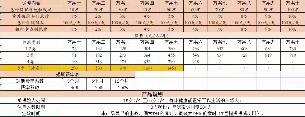 1.2.3类职业最高保障额:100万+10万保障,4类职业最高保额:60万+6万,5类职业最高保额:50万+5万。