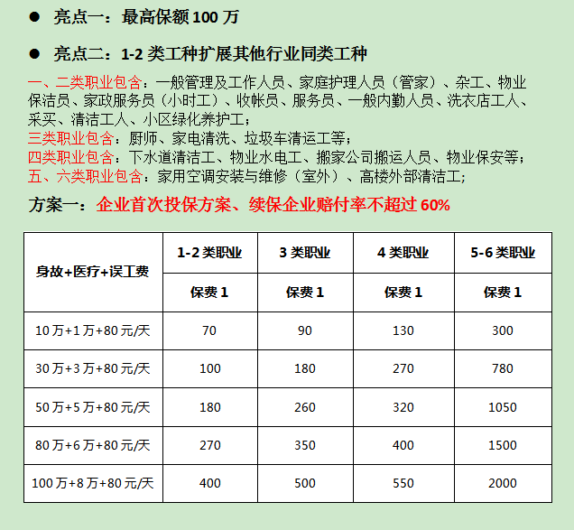 家政、清洁、高空1-6类职业方案(最高保额100万),性价比优,出单快,理赔速度和服务对接均是杠杠滴。