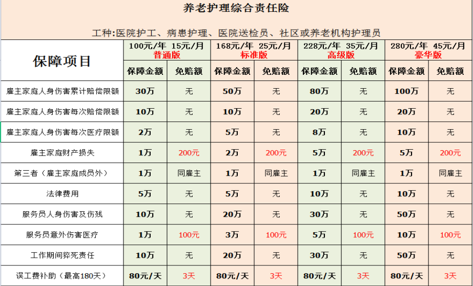 2.养老护理综合责任险,可承保职业【医院护工,病患护理,医院送检员,社区或养老机构护理员】