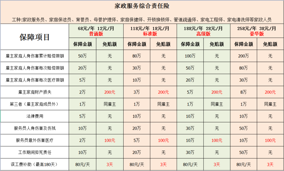 1.家政服务综合责任险,承保职业【家庭服务员,家庭保洁员,育婴员,母婴护理师,管道疏通师,家电清洗师等】