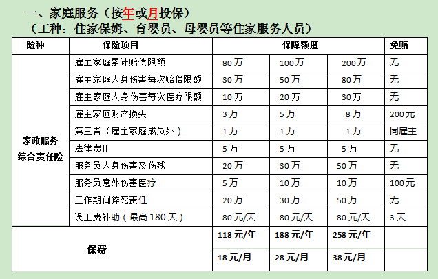 1.家政服务综合责任险,承保职业【住家保姆,育婴员,母婴员等住家服务人员】